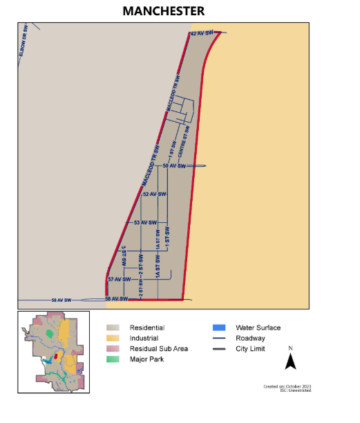 The area borders the Manchester industrial complex to the north, south, and east, while families, seniors, and students primarily reside near Macleod Trail to the west.