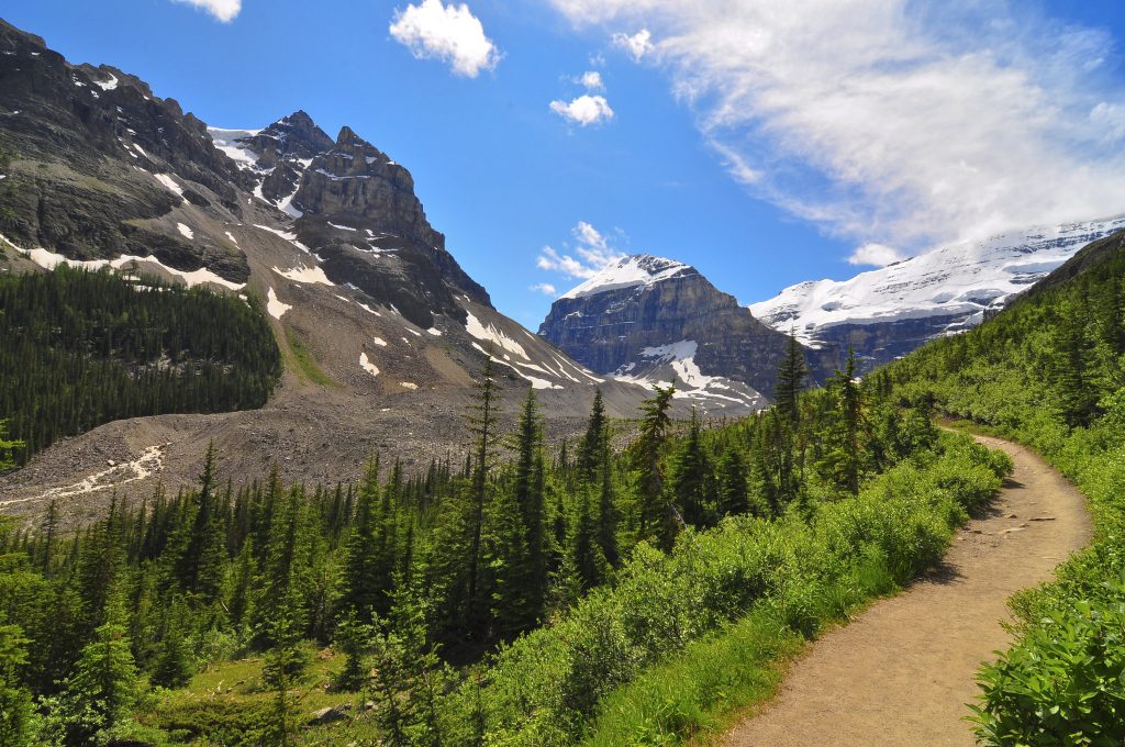 In Banff National Park, specifically at Lake Louise, there is a 14.6-kilometer hiking trail. It is a challenging route, with rocky, winding paths that lead visitors from the busy shores of Lake Louise to more secluded spots deep within the Rocky Mountains.