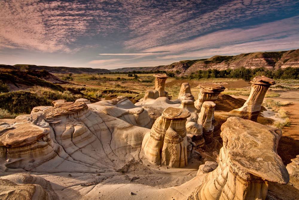 Canadian Badlands відомі своїм минулим, багатим на динозаврів. Із того часу тут залишилися реліквії з пісковика, які називають hoodoos. Вони формуються під впливом вітру та води впродовж мільйонів років і мають форму трохи дивних стовпів.